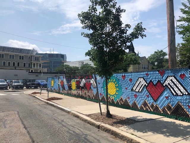 The Love is Everywhere mural was created by weaving polyethylene fence tape through chainlink fence. Teens were given a diagonal grid on which they could digitally render their designs. Once complete, the designs were presented and discussed. The group decided to combine three different design concepts together. After finalizing a design, teens installed the fence tape to create the mural.