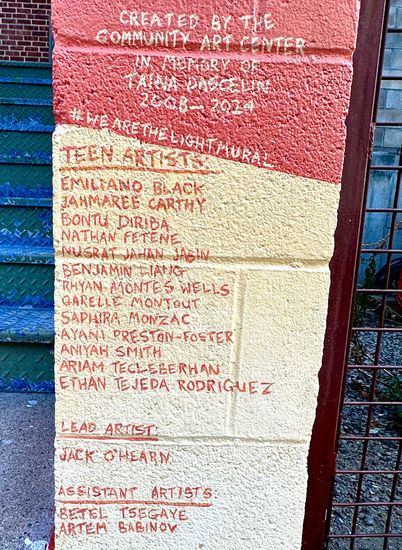 For this mural, teens met with a group of neighbors to discuss possible content for the mural. They then formed small teams of 2 to propose ideas to the larger group. After an exchange of ideas between the teens and the lead artist, a design was finalized and presented to the neighborhood group. The teens and neighbors wanted the mural to look like it belonged in the neighborhood while standing out as unique. They decided on using text as the main subject, and chose the phrase “We are the light,” which honors the memory of a late teen who had attended CAC.